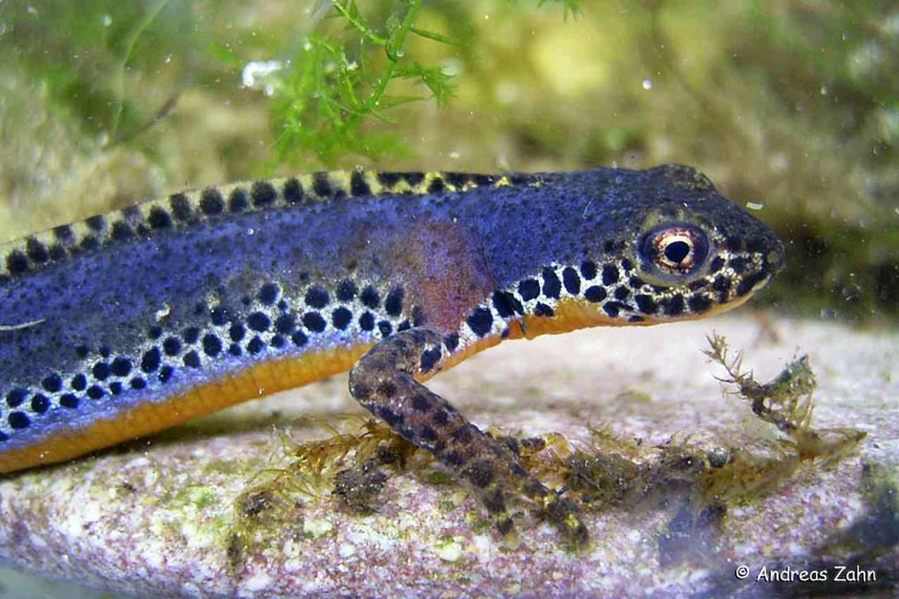 Der Kammmolch ist im Frühling am Rückenkamm und dem weißen Streifen am Schwanz erkennbar. Er bewohnt vor allem größere und tiefe Gewässer mit ausgeprägtem Bewuchs an Wasserpflanzen. An diesen legt er die Eier ab.