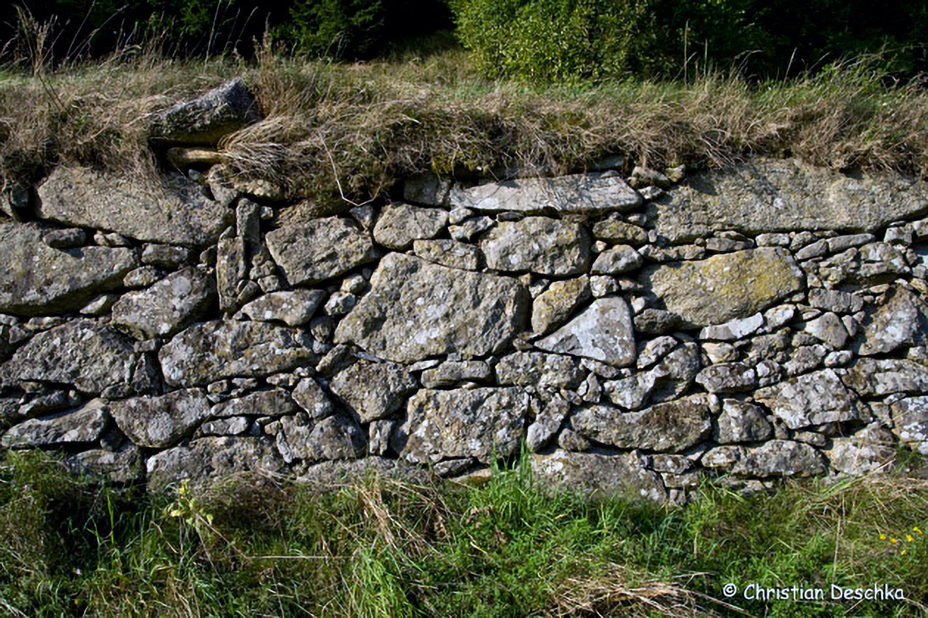 Legesteinmauern mit angrenzendem Altgras sind beliebte Aufenthaltsorte für Reptilien. Hier finden Eidechsen und Schlangen Verstecke, Sonnplätze und Beutetiere. Die wenigen Legesteinmauern sollten unbedingt erhalten werden.