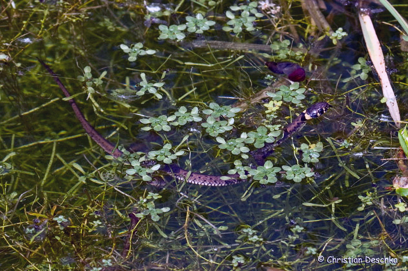 Die Ringelnatter ist an den zwei gelblichen Flecken hinter dem Kopf leicht erkennbar. Sie ist unsere häufigste Schlange und in stehenden Gewässern regelmäßig auf der Jagd zu beobachten.