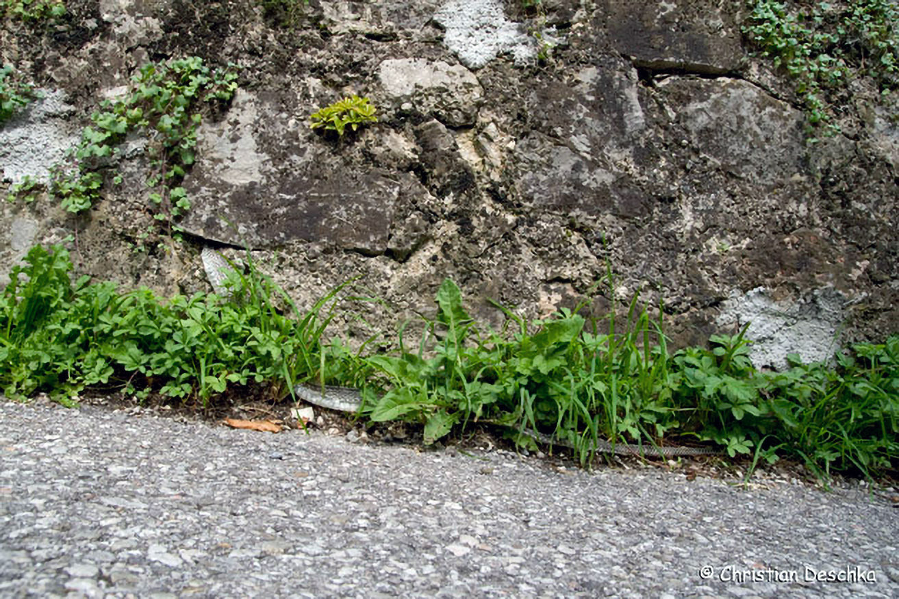 Diese Mauereidechse klettert gerade aus einem Mauerloch und wird damit ihrem Namen gerecht. Diese schlanke Eidechse kommt nur an steilen, felsigen und spärlichst bewachsenen Abschnitten im Donauraum vor.