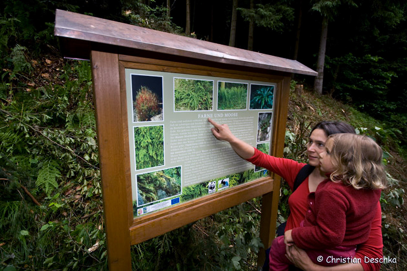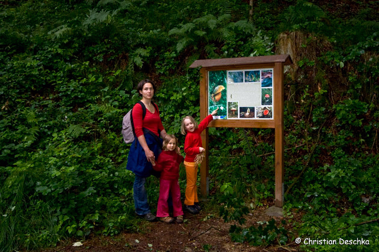 Anschließend führt der Weg durch geschlossenen Wald. Infotafeln bringen dem Besucher einige Pilze, Pflanzen und Tiere aus der Region näher.