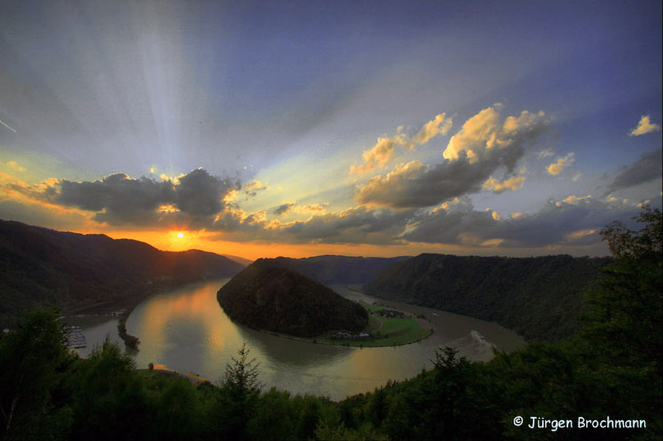 Der "Schlögener Blick" ist ein Aussichtspunkt am rechten (südlichen) Donauufer, von dem aus man die "Schlögener Schlinge" gut überblicken kann. Letztere wird gebildet, indem die Donau zweimal ihre Fließrichtung um rund 180 Grad ändert.