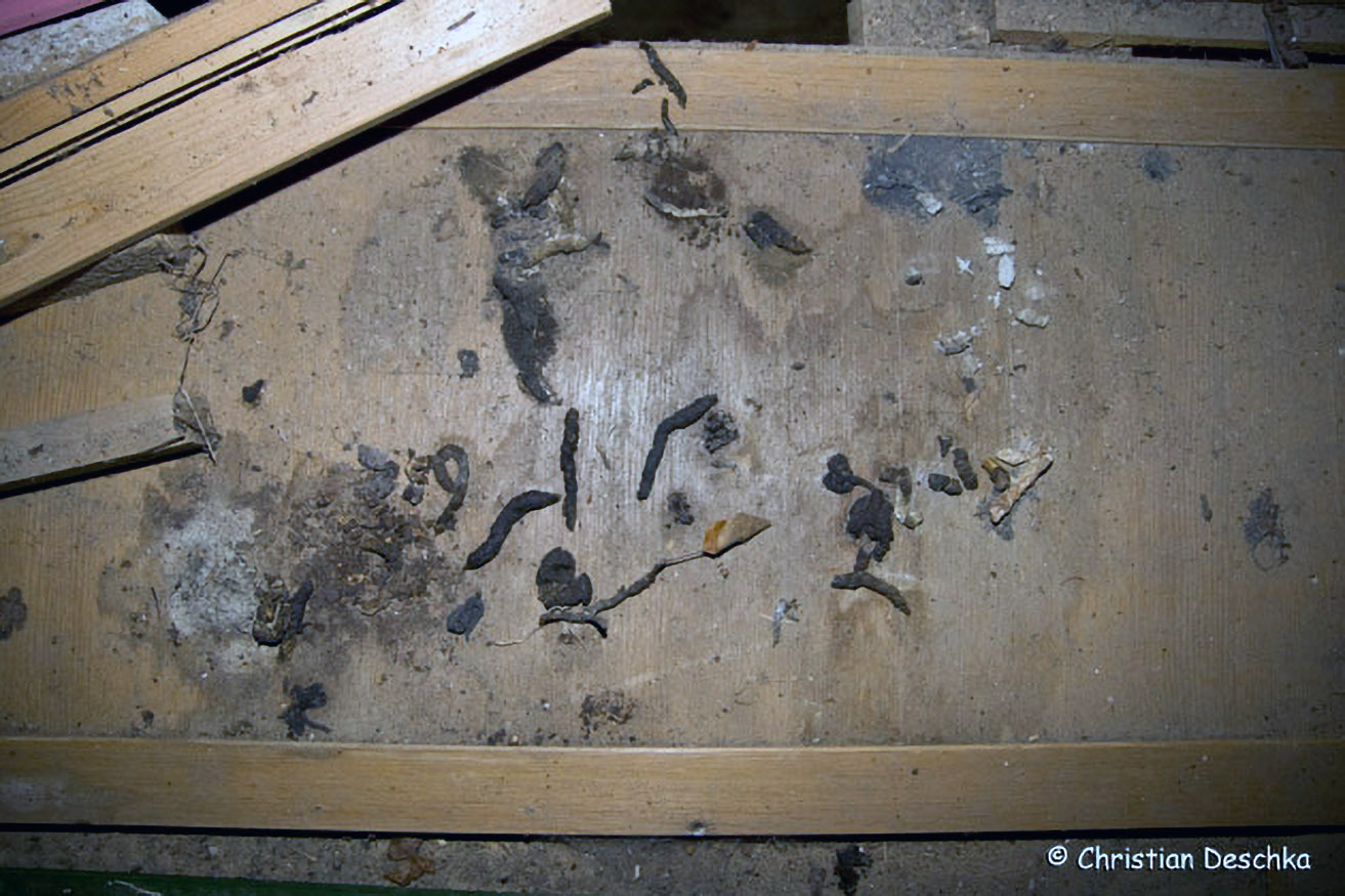 Die Fledermäuse selbst sieht man kaum. Man findet aber ihre Visitenkarten in Form von Kotkrümeln. Dieser gute Blumendünger zerbröselt im Unterschied zu Mäusekot leicht beim Zerreiben zwischen den Fingern.