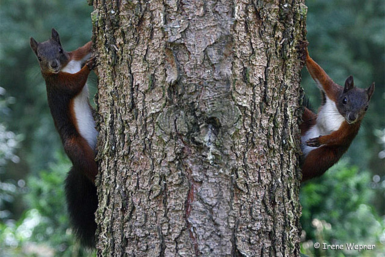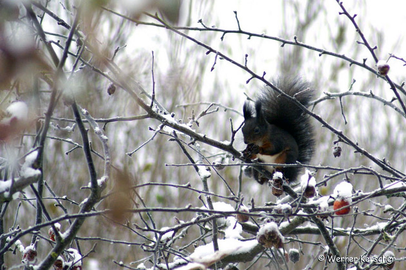 Auch am Land wagen sich Eichhörnchen im Herbst und im Winter gerne in unsere Gärten, um Nüsse und Obst zu ernten.