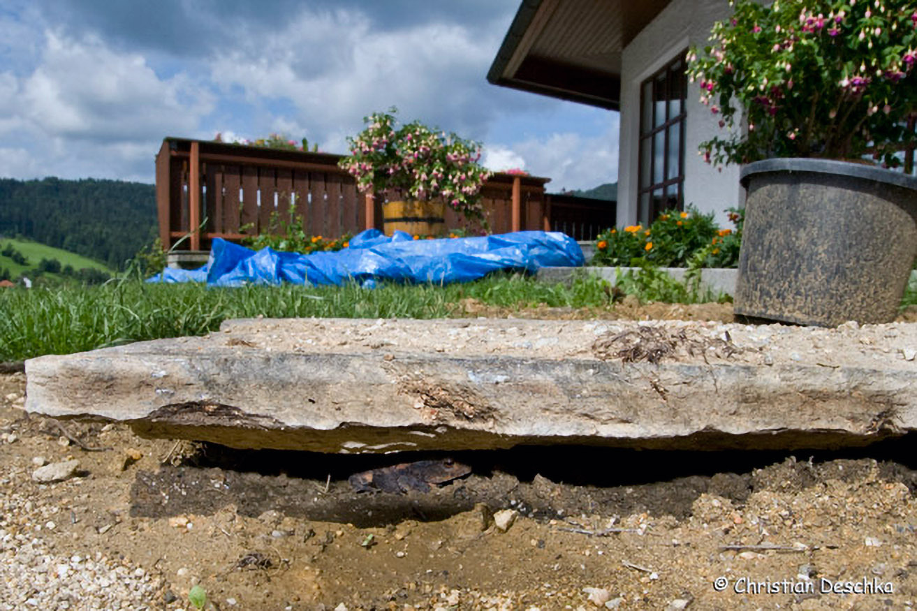Erdkröten sind nachtaktiv und verstecken sich tagsüber in schattigen, feuchten Hohlräumen, beispielsweise unter Steinen.