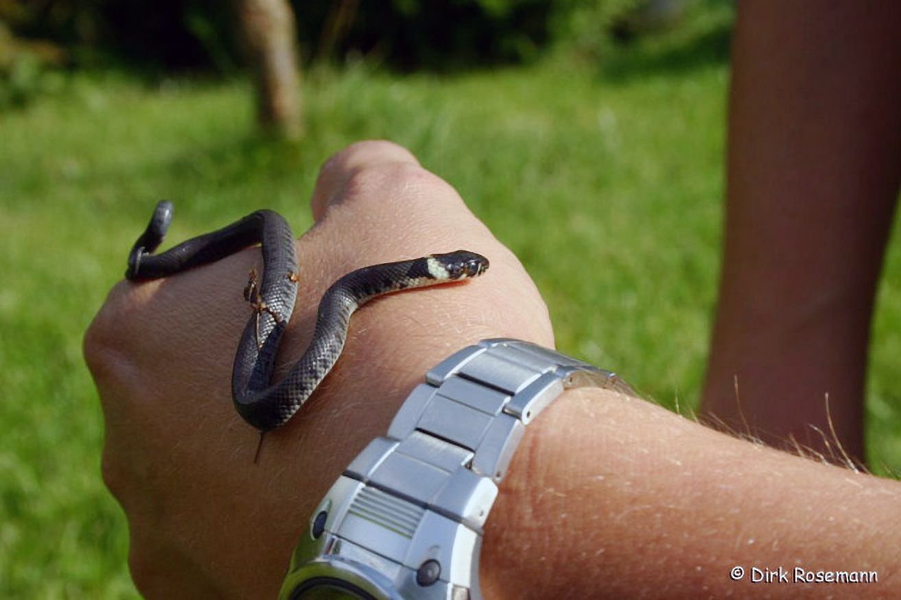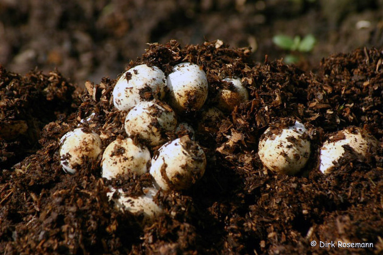 Die Eier werden von der im Kompost entstehenden Wärme ausgebrütet. Schließlich schlüpfen kleine Ringelnattern, die von Anfang an auf sich selbst gestellt sind.