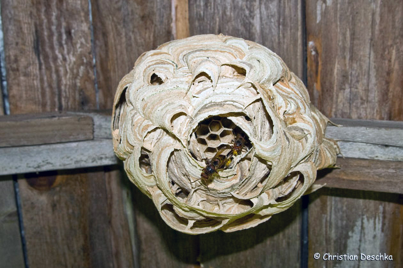 Auch Hornissen fühlen sich unter dem Dach des Menschen wohl. Sie raspeln Holz von alten Brettern und kleben es mit Speichel zu kunstvollen Nestern, in denen sie ihre Jungen aufziehen.