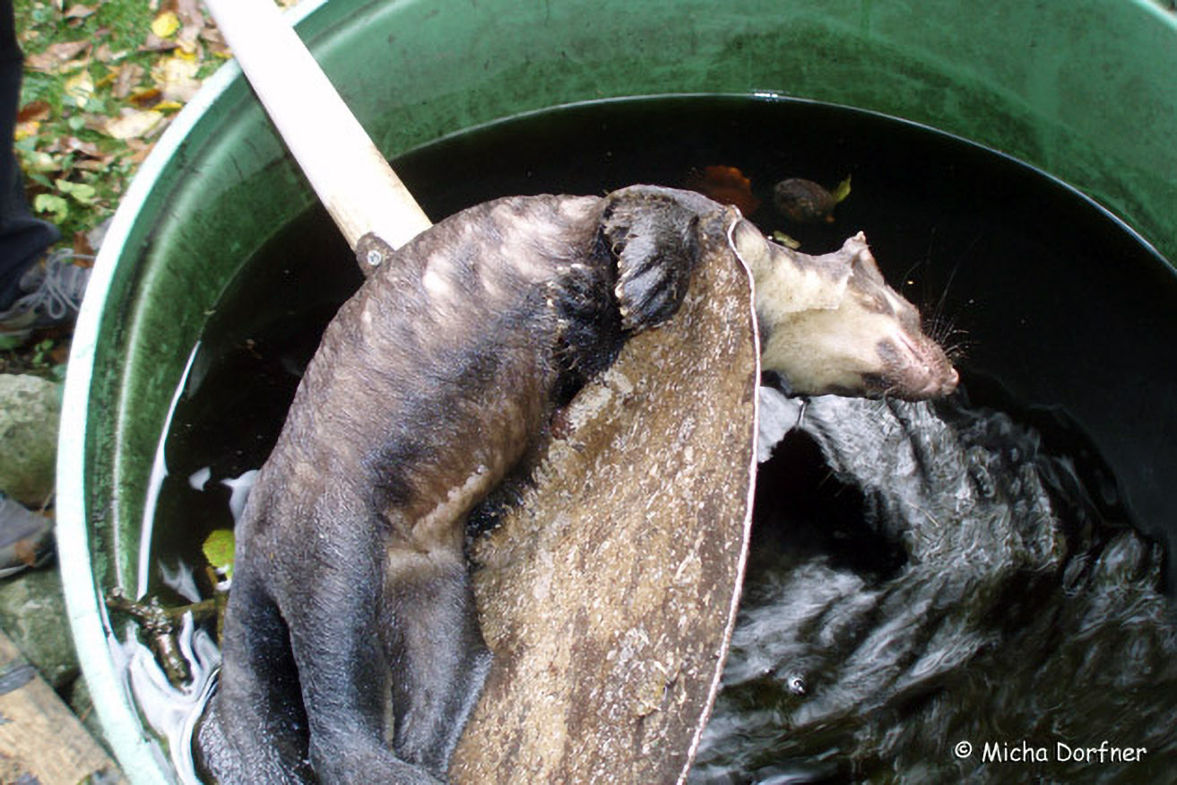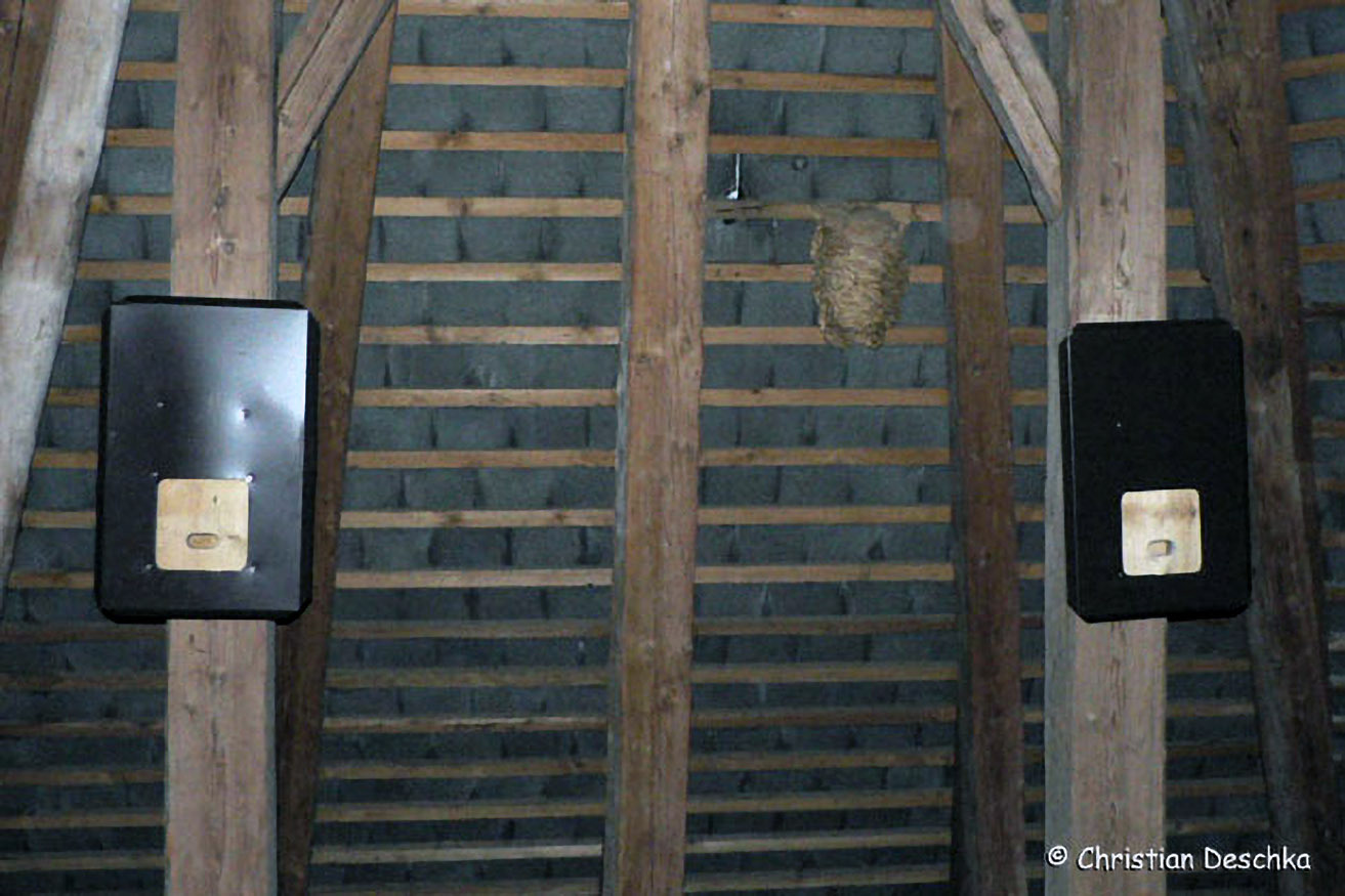 Da dem Steinmarder z.B. in Kirchendachböden ganze Fledermauskolonien bzw. Wochenstuben zum Opfer fallen können, sollten Fledermauskästen mit einem vorspringenden Blech geschützt werden.