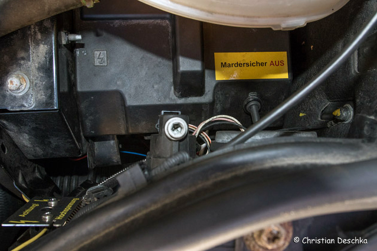 Ein beschrifteter Kippschalter ermöglicht für Wartungsarbeiten und Reparaturen das vorübergehende Ausschalten der Marderabwehr.