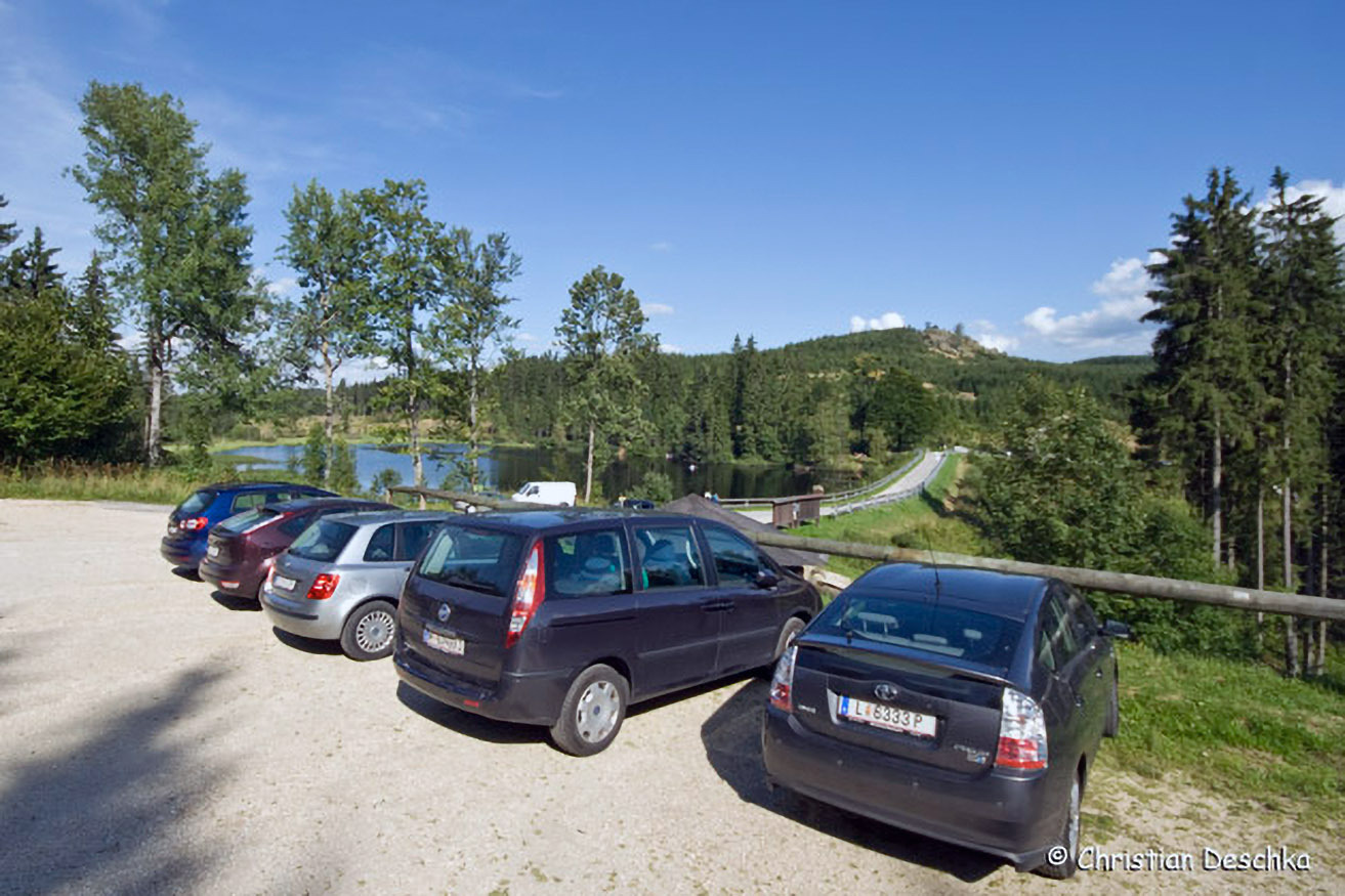 Nach rund 100 Metern verlassen wir die Forststraße und folgen dem Wanderweg am Teichufer.