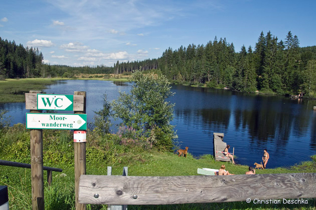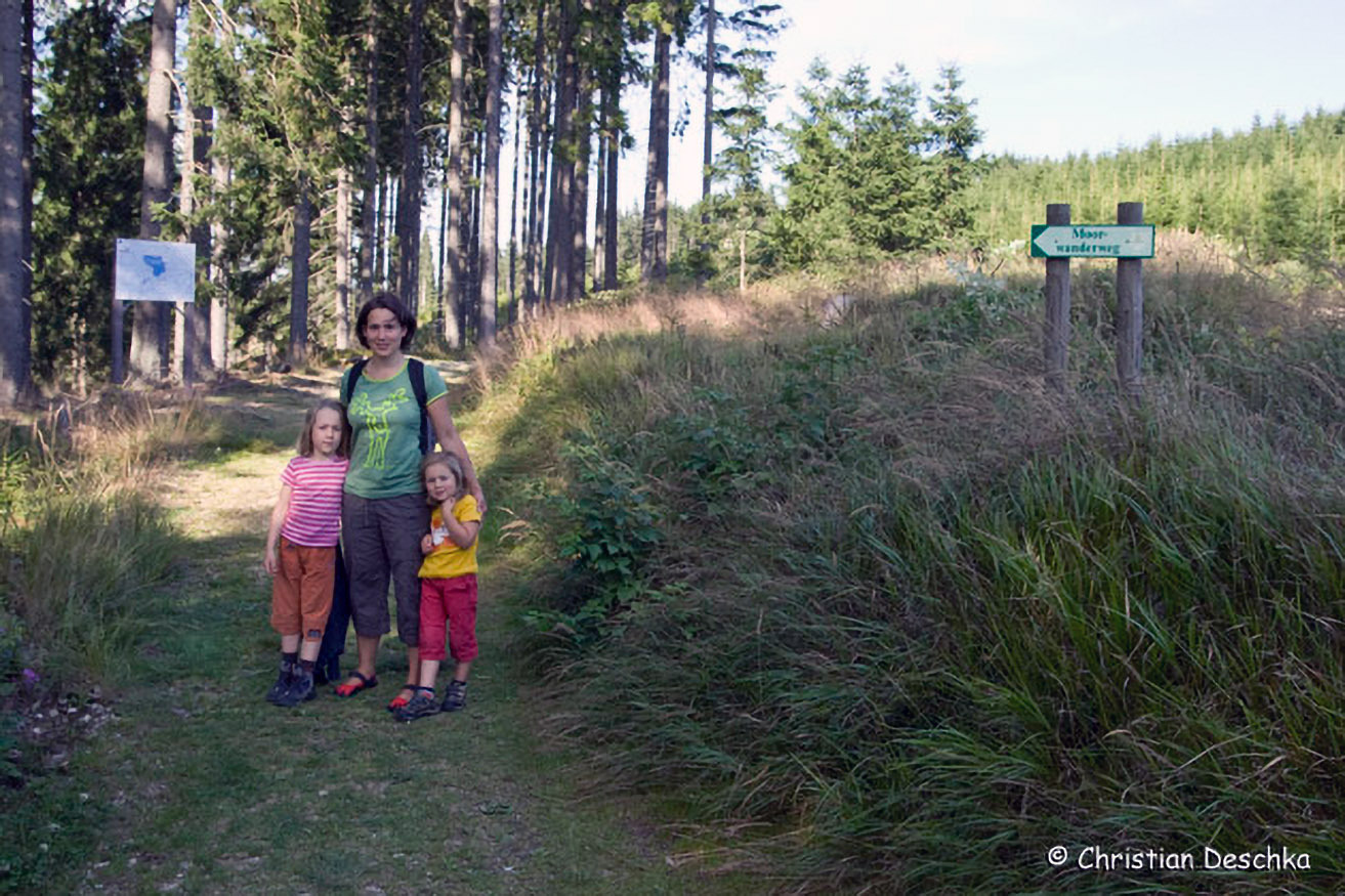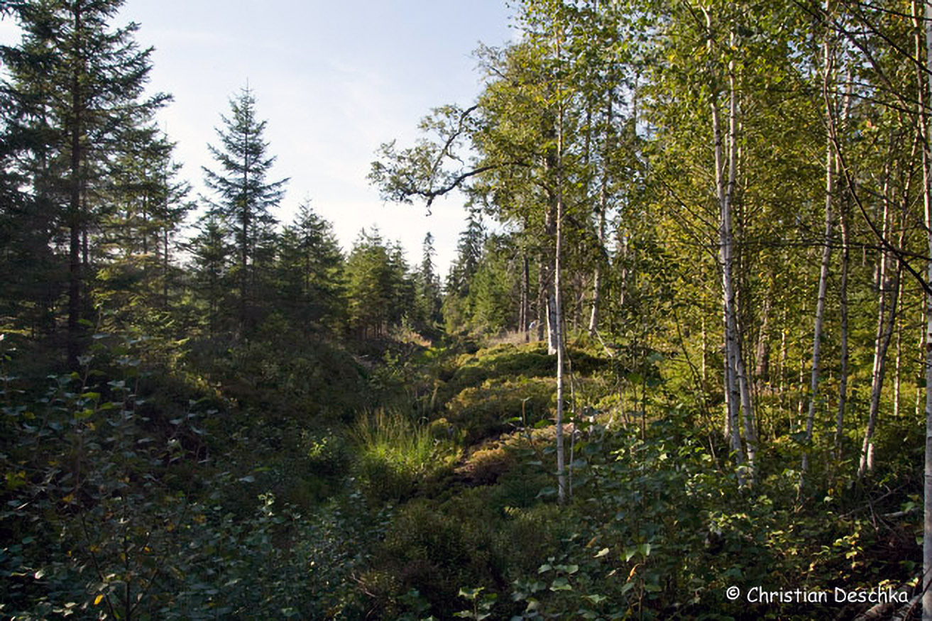 Kurz darauf sieht man noch einen verwachsenen Graben, der einst zur Entwässerung des Moores errichtet wurde. Ziel war damals das Pflanzen von Fichten. Mittlerweile hat man erkannt, dass man hier keine lukrative Forstwirtschaft betreiben kann.