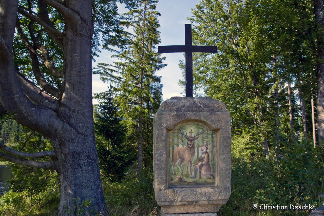 Der Wanderweg zweigt auf der Ostseite des Teiches bei einem Hubertus-Marterl von der Straße ab und führt Richtung Norden.