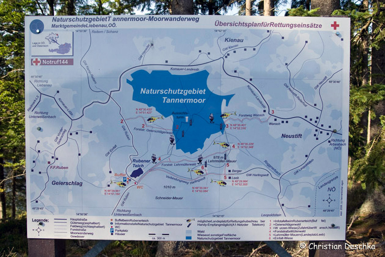 Eine Gebietskarte gibt einen Überblick über die Umgebung und das Naturschutzgebiet. Dort sind für Notfälle auch Hubschrauberlandeplätze ausgewiesen.