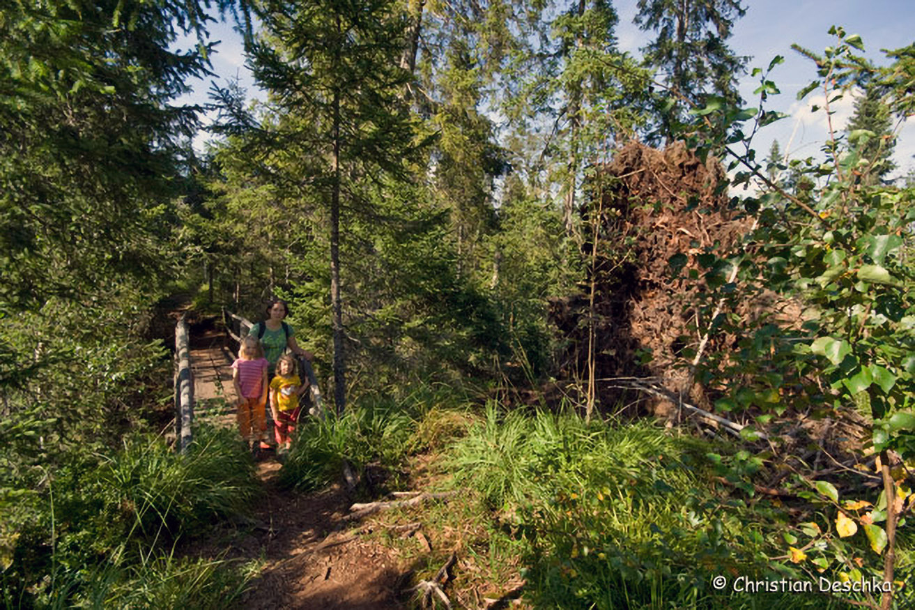 Im Bereich dieser Holzbrücke über den Tannerbach bekommt der Wald schon einen Moorcharakter.
