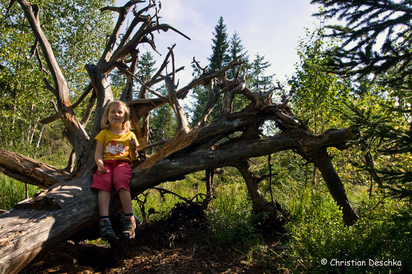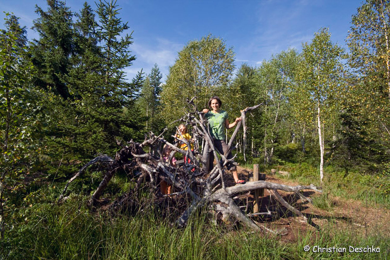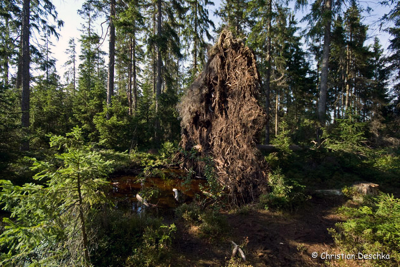 Bei einer entwurzelten Fichte wurde ein Rastplatz eingerichtet.