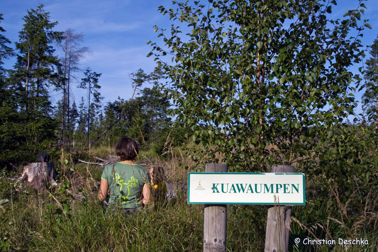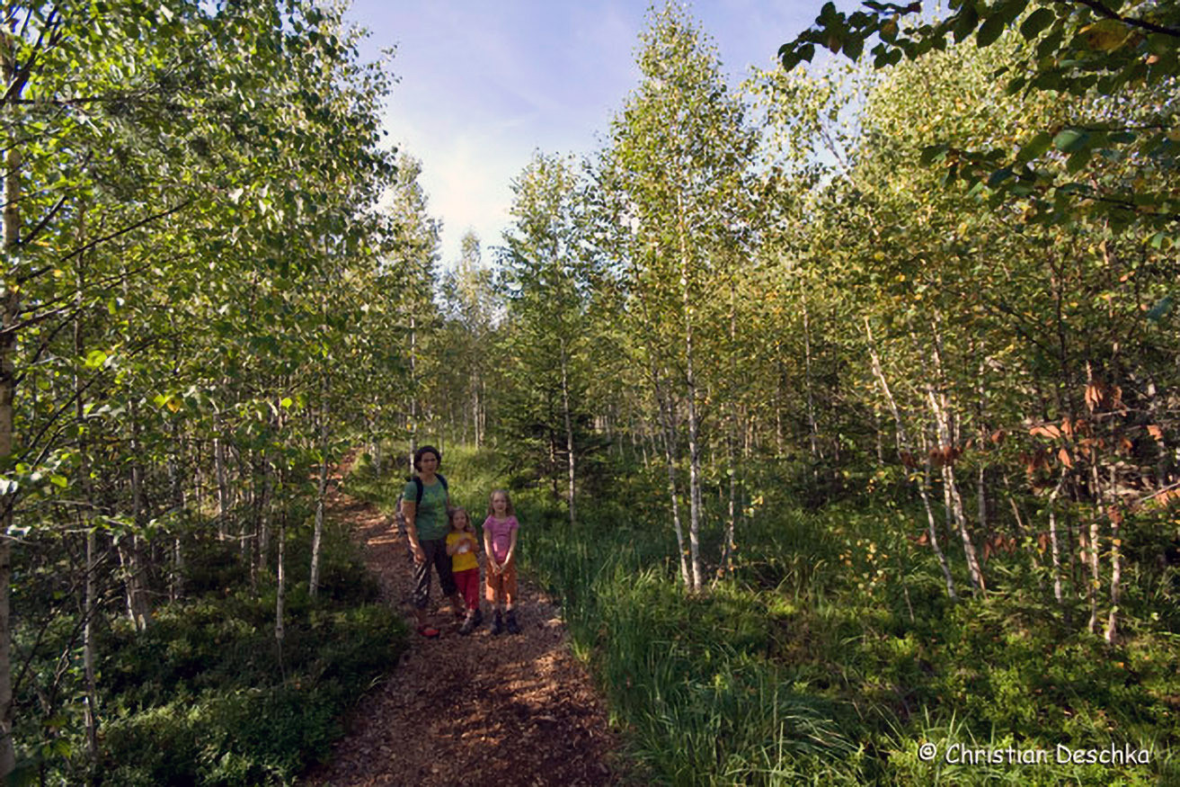 Im Anschluss wandern wir durch einen birkenreichen Teil des Moores. Auch dieser Teil des Moores war einst von Latschen bewachsen. Birken gedeihen hier nur aufgrund von Moorentwässerungen.