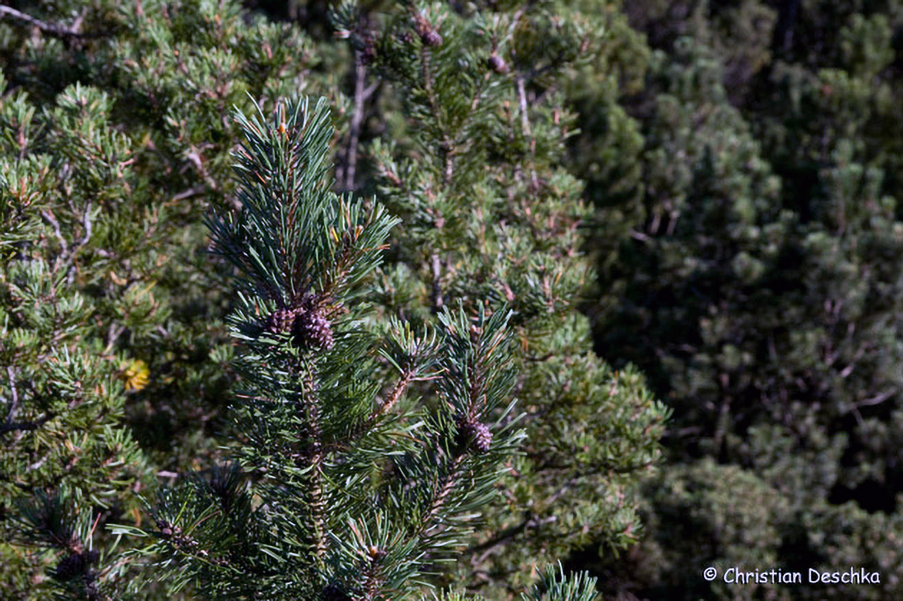 Latschen sind immergrüne Nadelgehölze mit kleinen, eiförmigen Zapfen.