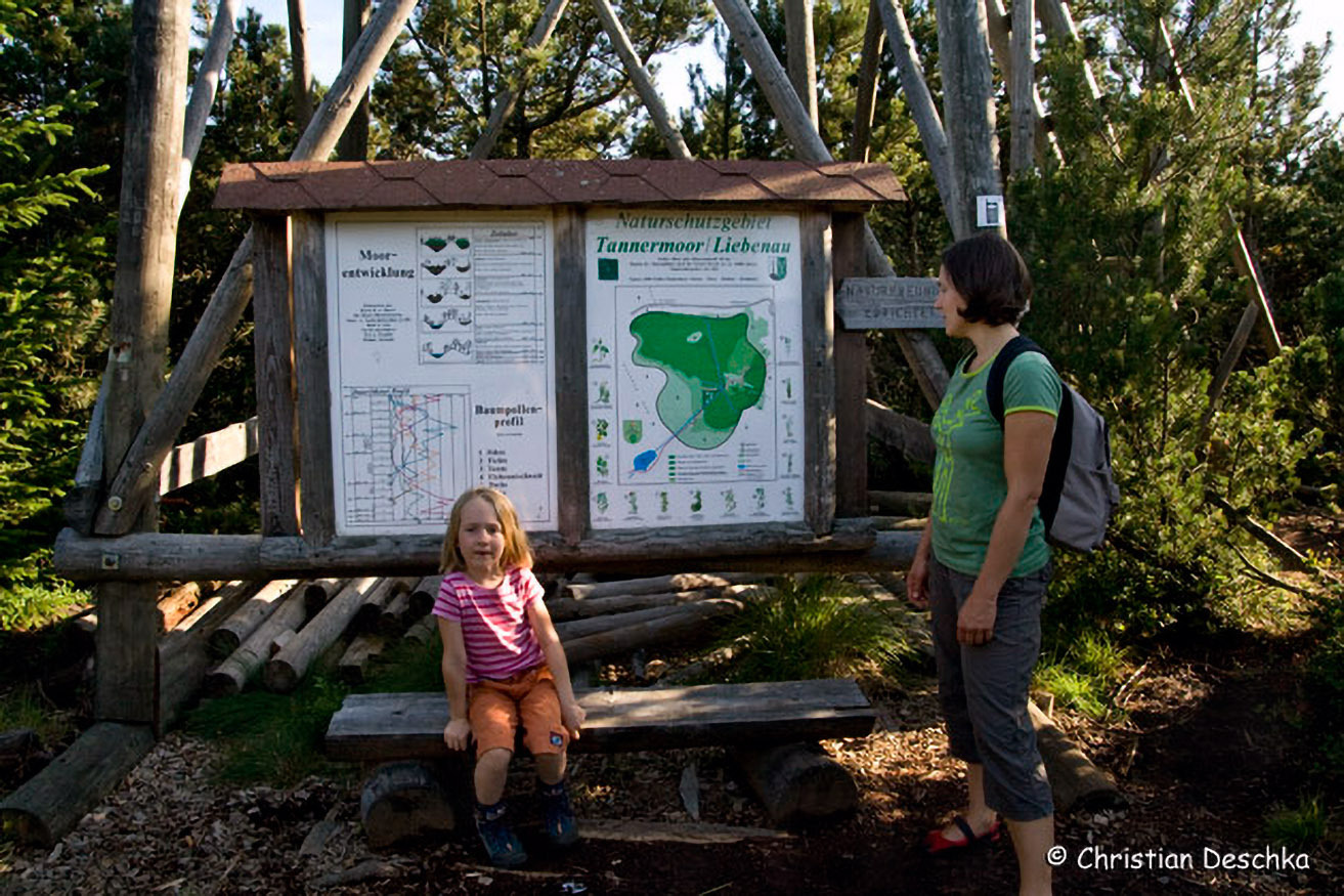 An der Basis des Turms erläutert eine Tafel die Entstehung des Moores und die Tatsache, dass Moore die Vegetation seit der Eiszeit dokumentieren. Im Torf des Moorkörpers werden nämlich neben Pflanzenteilen auch ...