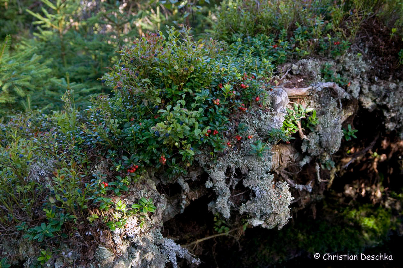 Auf diesem Wurzelteller eines umgestürzten Baumes wachsen Heidelbeeren und Preiselbeeren sowie grüngraue Flechten.