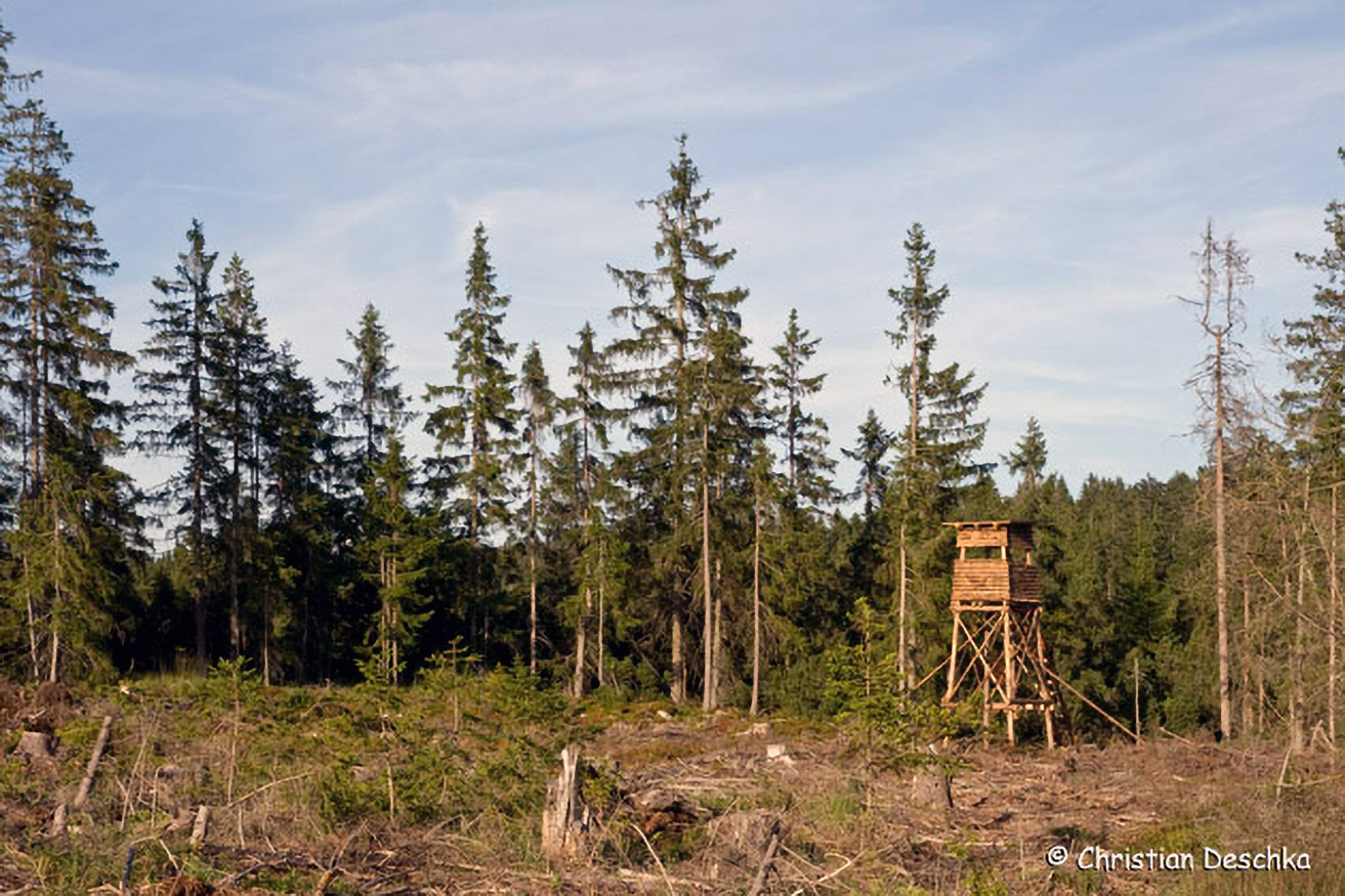 Auf einer Lichtung kommen wir an einem Hochstand vorbei.