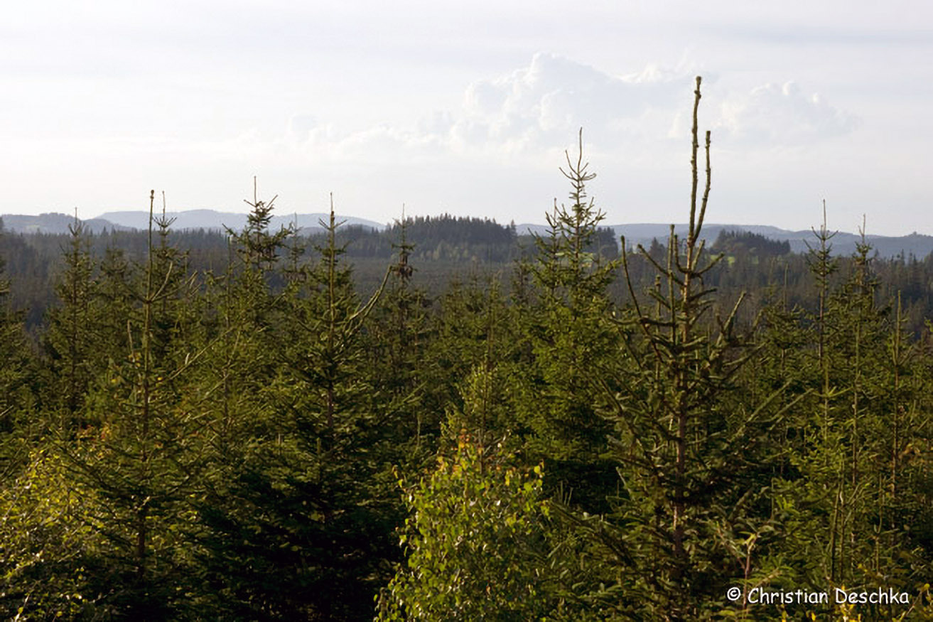 Der erste Abschnitt des Weges führt durch in dieser Gegend leider sehr weitverbreitete Fichtenmonokulturen. Die gleich alten Bäume bilden instabile Bestände ("Altersklassenwald") und sind anfällig für Borkenkäfer und Windwürfe.