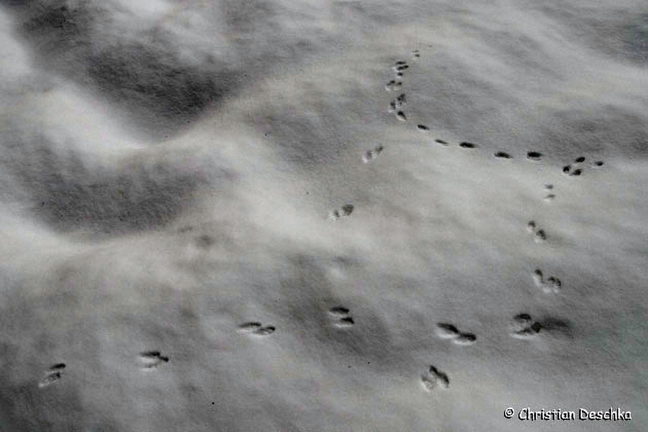 Dies sieht man gut an dieser Mauswieselspur. Die Spuren dieses kleinsten Raubtieres der Welt führen von rechts ins Bild, verlaufen in der Bildmitte unter dem Schnee und führen links vor den Grasbüscheln wieder aus dem Bild.