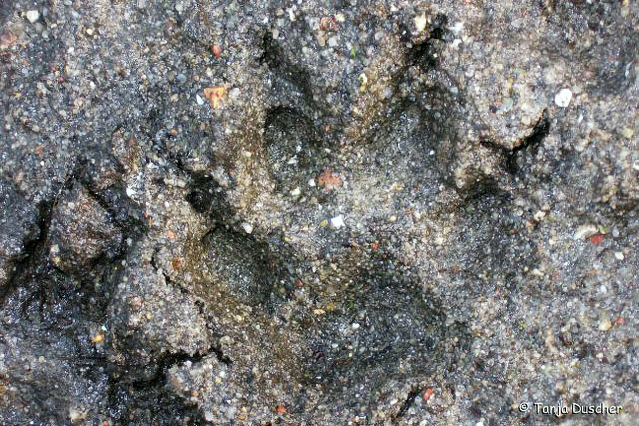 Marderhunde hinterlassen etwa fuchsgroße, aber durch stärker gespreizte Zehenballen insgesamt rundlichere Trittsiegel.