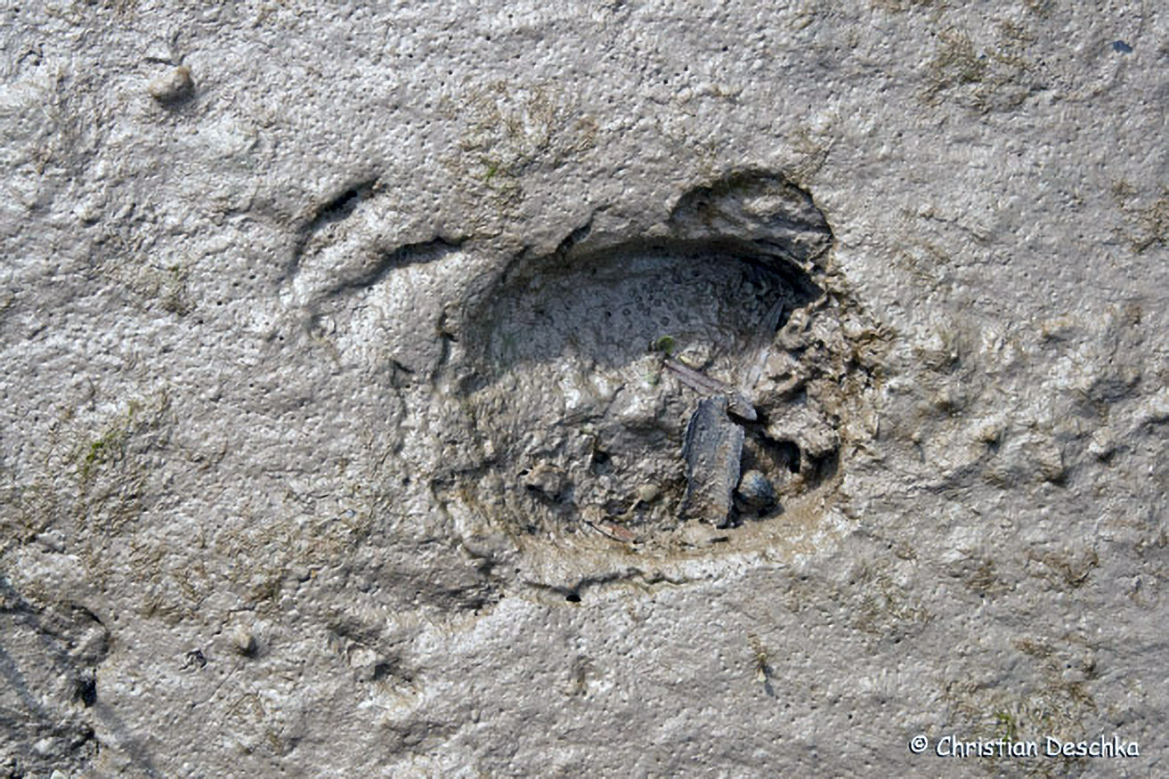 Bei Rothirsch-Trittsiegeln ist meist kein Abdruck der Nebenzehen sichtbar. Die rundlichen Ballen am Hinterende nehmen etwa ein Drittel der Schalenlänge ein.