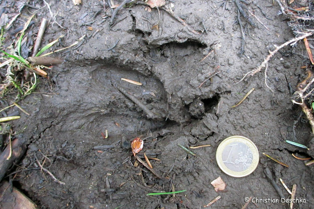 Hier sehen wir einen Abdruck der Braunbären-Vorderbrante. Da der Fersenballen wie fast immer fehlt, ist das Trittsiegel breiter als lang.