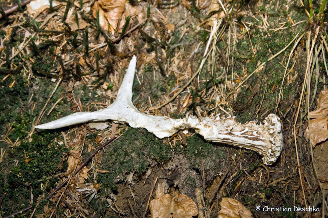 Das Geweih wird im Herbst abgeworfen. Findet man es erst Monate oder Jahre später, ist es oft von Mäusen und Eichhörnchen angenagt.
