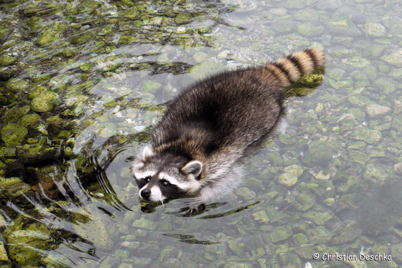 Waschbären erweisen sich dabei auch als hervorragende Schwimmer. Wie alle Wasserbewohner haben diese "Kleinbären" einen wasserabweisenden, dichten Pelz.