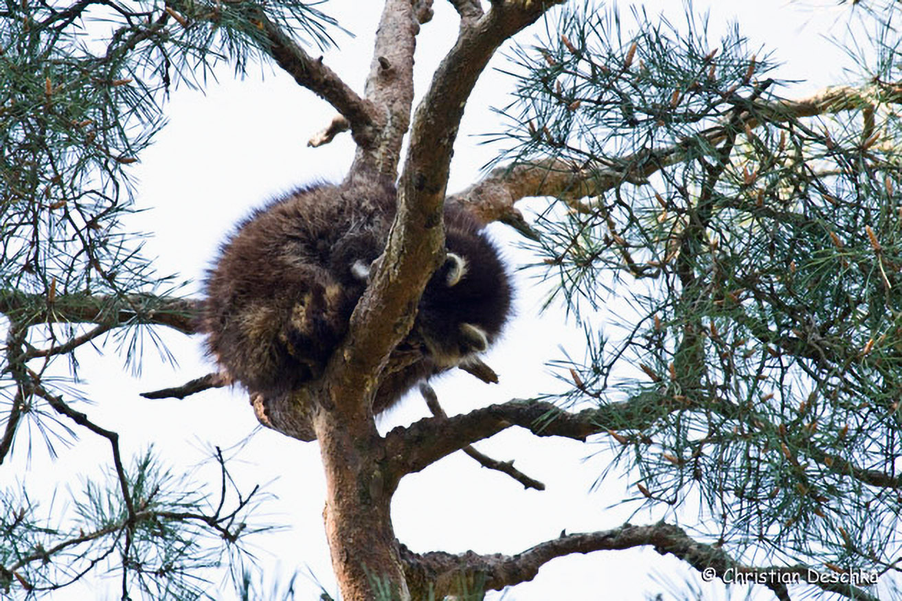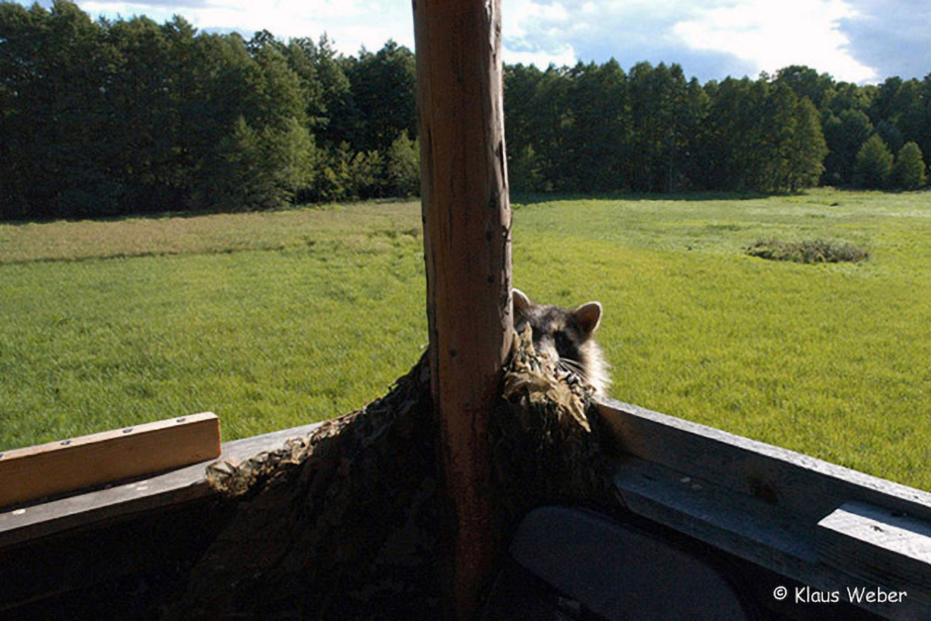 Dieser Waschbär nützte gar einen Hochstand als Tageslager. Beim Auftauchen des Fotografen ergriff er die Flucht ...