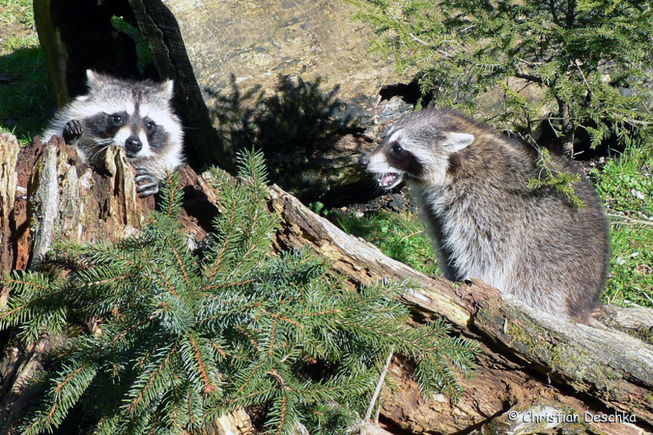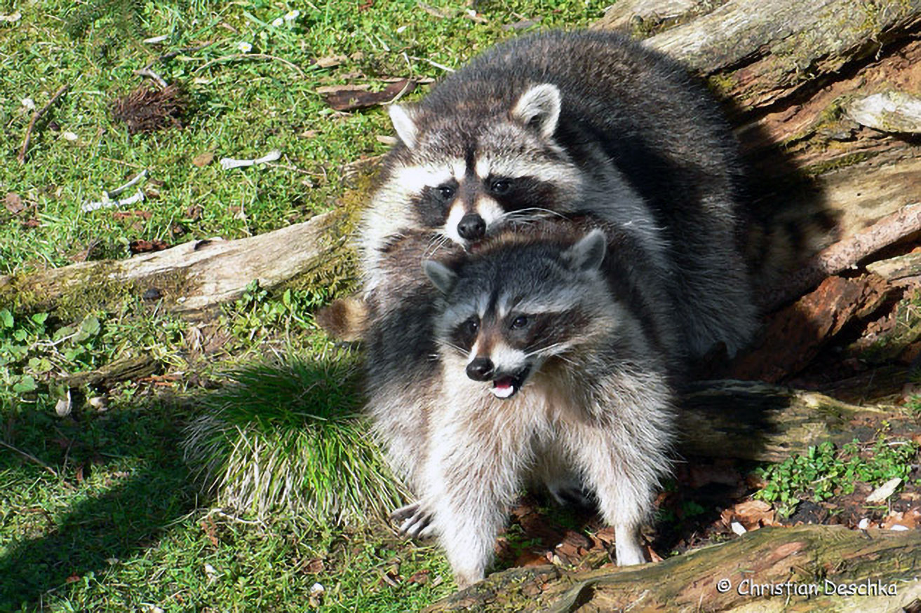 Die schwarz-weiße Gesichtszeichnung und die schwarz-weiß geringelte Lunte dienen den geselligen und nachtaktiven Waschbären als „Positionslichter“ und erleichtern die gegenseitige Wahrnehmung und Kommunikation mittels Körpersprache.