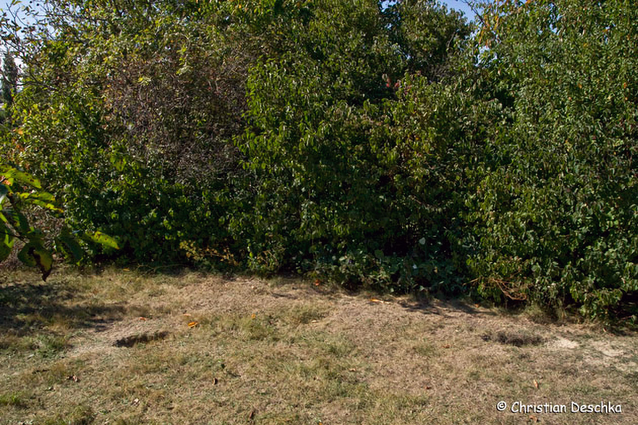 Von diesem Bau sind zwei Ein- bzw. Ausfahrten zu sehen. In der Hecke befinden sich weitere Fluchtröhren.